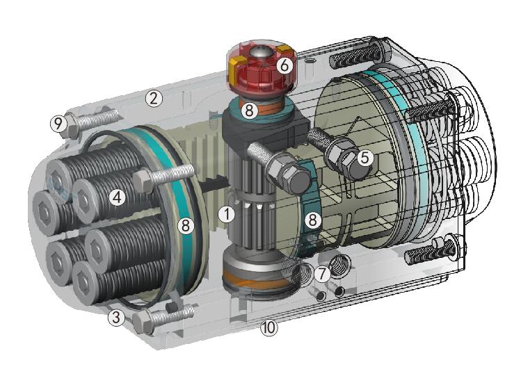 ⑧齒條背面的復(fù)合材料軸瓦和活塞導(dǎo)向環(huán)以及輸出軸的軸承等為防止金屬對金屬的摩擦,并且增加潤滑,使其低摩擦、長壽命。